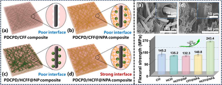 近日,课题组在Chemical Engineering Journal期刊上发表题为Arraying calcium carbonate core-shell nanoparticles densely on carbon fibers by coordination effect for interfacial enhancement of polydicyclopentadiene/carbon fiber felt (PDCPD/CFF) composites 的研究论文。碳纤维增强聚合物复合材料(CFRPCs)因其具有高强度、高模量、耐高温及低密度等显著优势,可被广泛应用于航空航天、汽车制造等领域。然而,由于碳纤维本身惰性较强,导致其与聚合物基体之间的界面结合力通常较弱,直接复合反而会劣化其性能。基于此,本研究提出了一种通过双配位作用在碳纤维毡表面负载碳酸钙核壳纳米粒子(NPA)的新策略,显著提升了聚双环戊二烯/碳纤维毡复合材料的界面结合性能。研究团队首先合成了以降冰片烯二羧酸钙为壳、碳酸钙为核的NPA纳米粒子,随后通过羧基-钙配位作用将其牢固地锚定在酸化处理的碳纤维毡表面,获得兼具高表面粗糙度和高反应活性的HCFF@NPA杂化纤维毡。其次,NPA表面的降冰片烯单元可与DCPD单体发生开环易位聚合(ROMP)反应,HCFF@NPA与PDCPD基体之间形成了稳定的界面结合。实验结果表明,所制备的PDCPD/HCFF@NPA复合材料的层间剪切强度和弯曲强度分别达到24.1 MPa和243.4 MPa,相比未修饰的PDCPD/CFF复合材料分别提高了125% 和68%。
